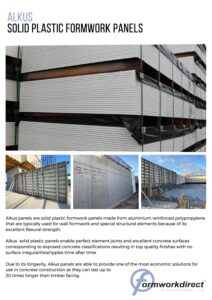 Alkus panels are solid plastic formwork panels made from aluminium reinforced polypropylene that are typically used for wall formwork and special structural elements because of its excellent flexural strength.