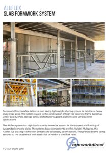 Formwork Direct Aluflex delivers a cost saving lightweight shoring system or provides a heavy duty single prop. The system is used in the construction of high rise concrete frame buildings, under pass tunnels, storage tanks, shaft shutter support platforms and various other applications.