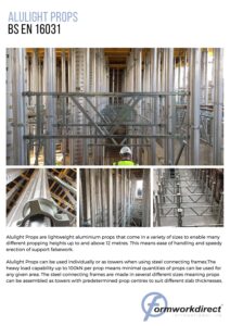 Our Alulight multiprops are lightweight aluminium props that come in a variety of sizes to enable many different propping heights up to and above 12 metres. This means ease of handling and speedy erection of support falsework.