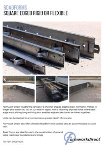 Formwork Direct Roadforms consist of a channel-shaped steel section, normally 3 metres in length and either 100, 150 or 200 mm in depth, with 3 fastening brackets fixed to the back edge and a sliding tongue-fitting that enables adjacent section to be linked together.
