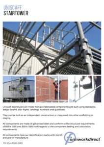 The Uniscaff Haki Stairtower is made from pre-fabricated components and built using standards, ledger beams, stair flights, landings, handrails and guardrails.